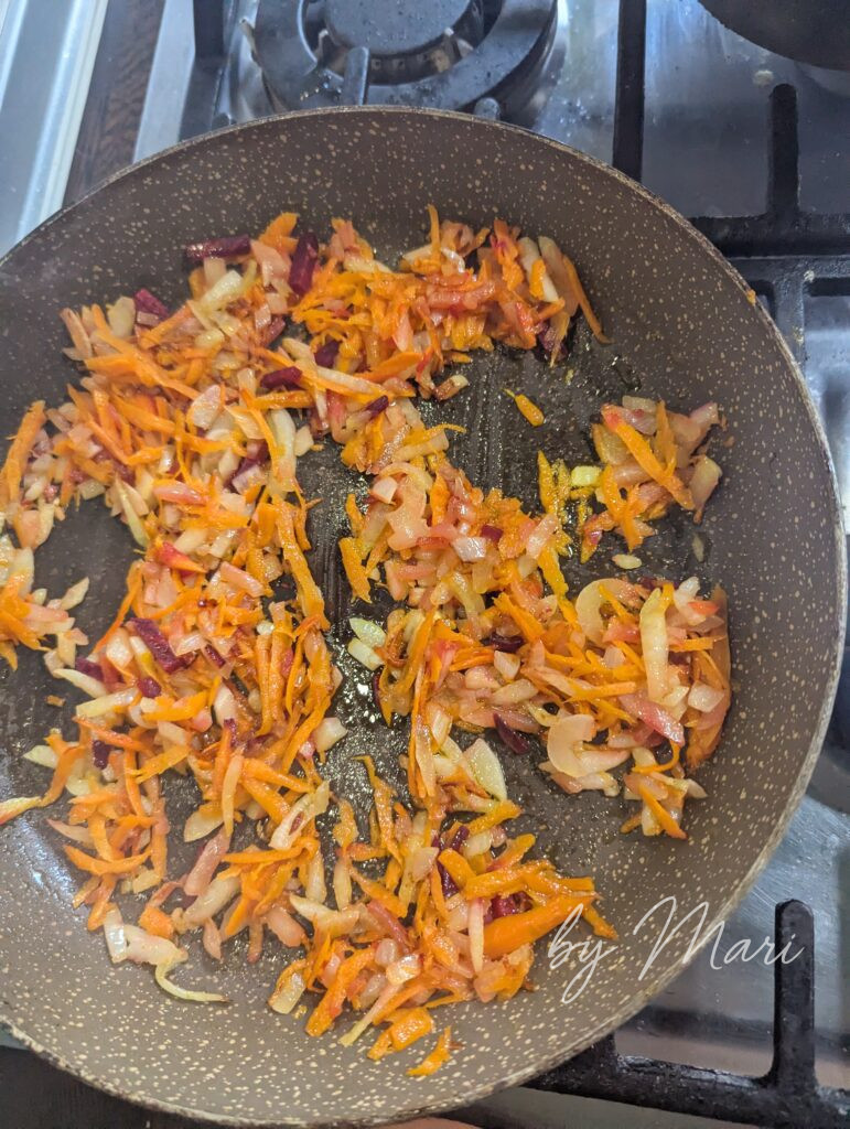 - Обжарь морковь и лук до золотистого цвета, отложи.