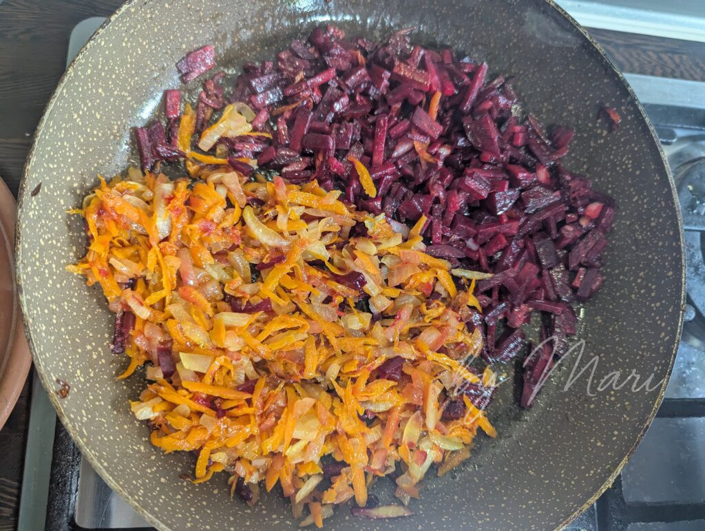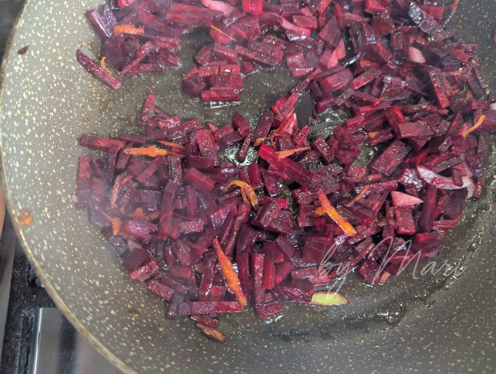- В той же сковороде обжарь свеклу 5–7 минут.