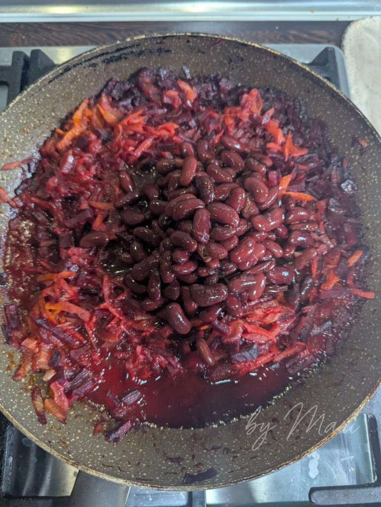 - Влей к свекле, добавь обжаренные морковь, лук и мелко нарезанный болгарский перец. Протуши всё вместе 2–3 минуты. Добавь фасоль.