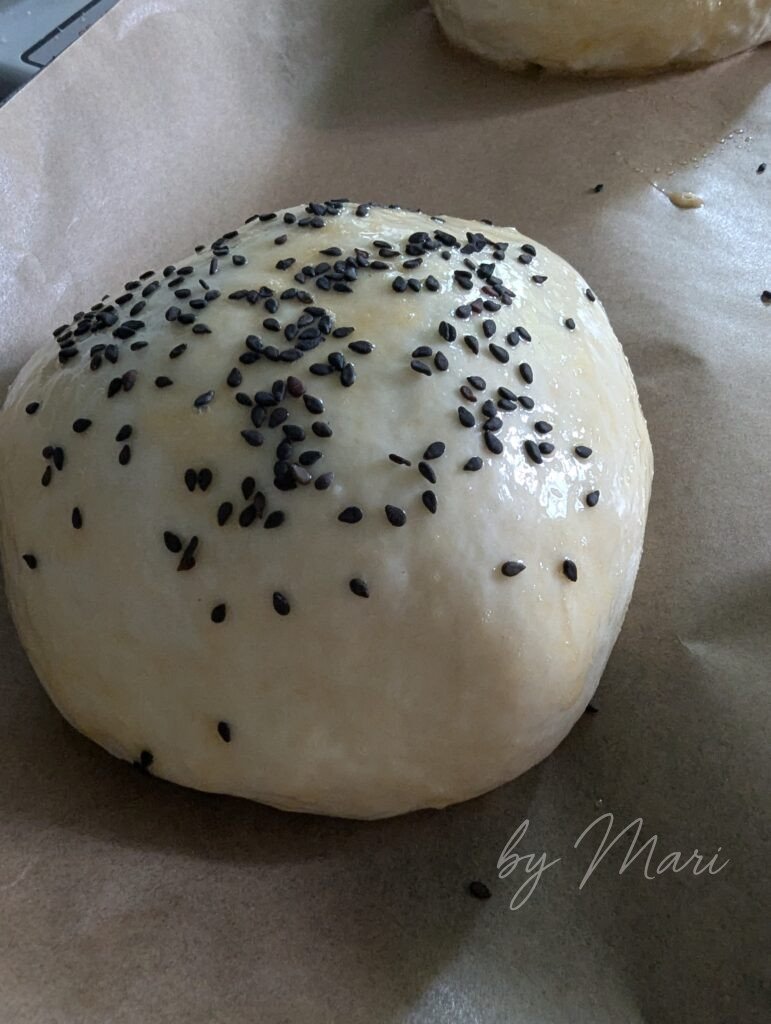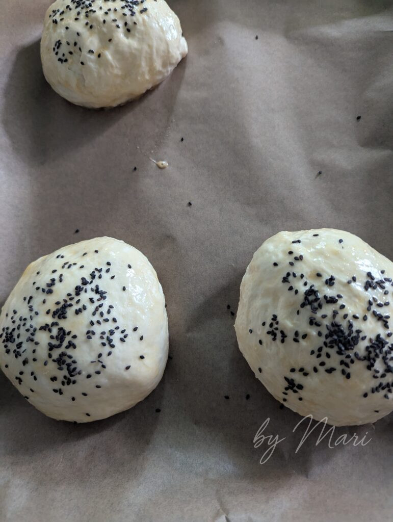 - Подготовка к выпечке. При желании смажьте булочки молоком или взбитым яйцом и посыпьте кунжутом — белым, чёрным или смесью.