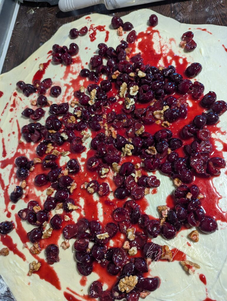 Штрудель с вишней и грецким орехом — это уютный аромат домашней выпечки, хрустящее тонкое тесто и кисло‑сладкая начинка.