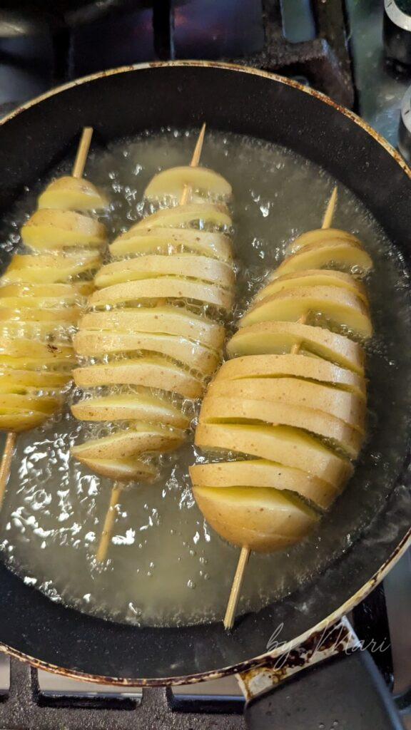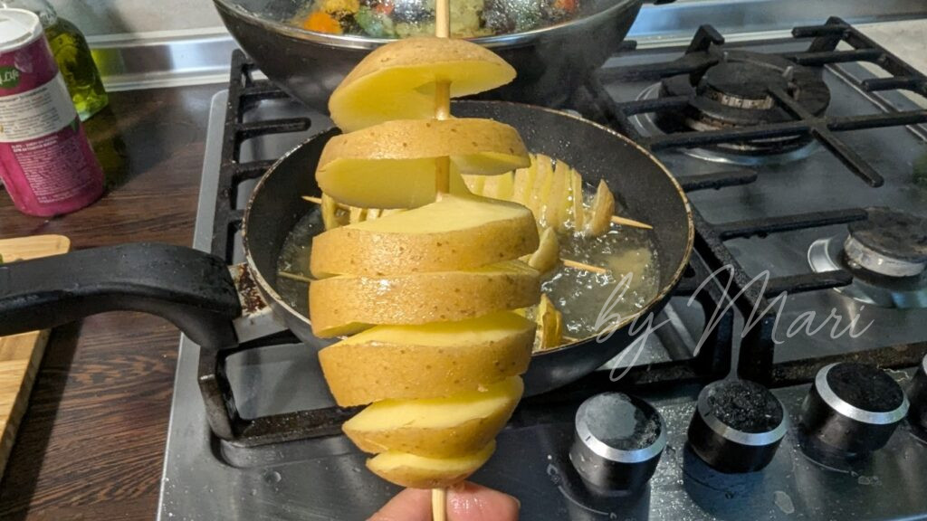 - Жарка: Обжаривайте спиральные ломтики на среднем огне до румяной корочки, переворачивая по мере необходимости. Посолите и добавьте специи в самом конце, чтобы они не подгорели.