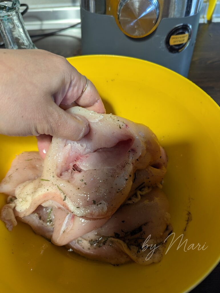 В каждой грудке аккуратно сделать кармашек и положить творожный сыр.