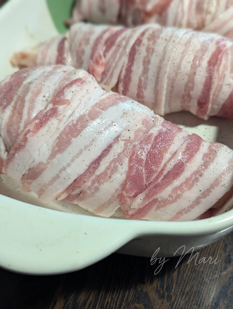 Обернуть ломтиками бекона, слегка прижать, чтобы бекон «запечатал» разрез.