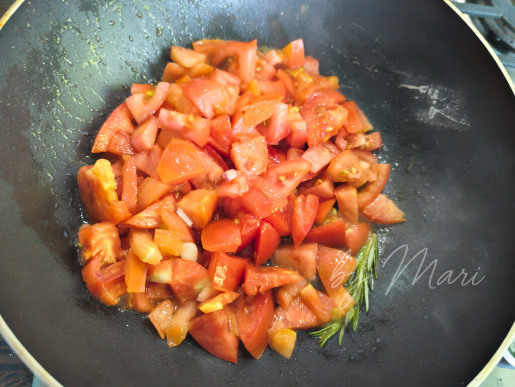 - ΠΠ° ΡΠΊΠΎΠ²ΠΎΡΠΎΠ΄Π΅ ΡΠ°Π·ΠΎΠ³ΡΠ΅ΠΉΡΠ΅ ΠΎΠ»ΠΈΠ²ΠΊΠΎΠ²ΠΎΠ΅ ΠΌΠ°ΡΠ»ΠΎ, Π΄ΠΎΠ±Π°Π²ΡΡΠ΅ Π½Π°ΡΠ΅Π·Π°Π½Π½ΡΠ΅ ΡΠΎΠΌΠ°ΡΡ. Π’ΡΡΠΈΡΠ΅, ΠΏΠΎΠΊΠ° Π½Π΅ ΠΏΠΎΠ»ΡΡΠΈΡΡΡ Π³ΡΡΡΠΎΠΉ ΡΠΎΡΡ.