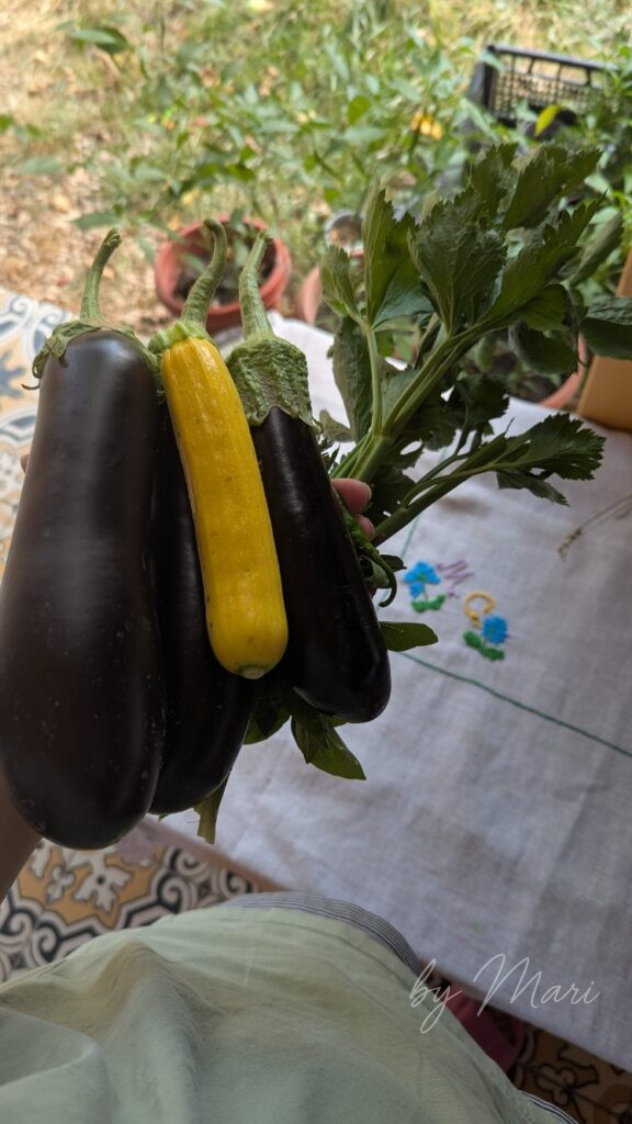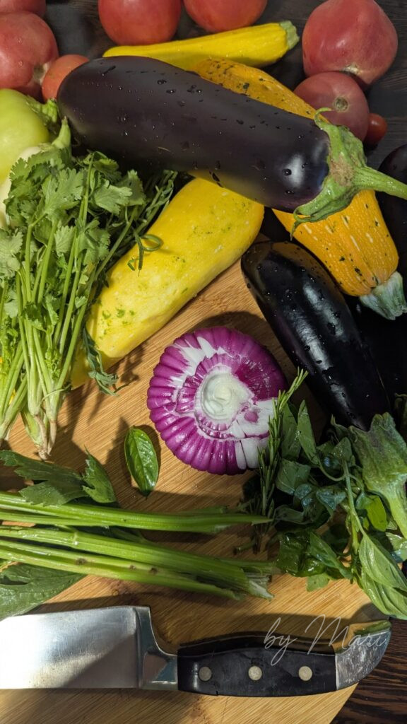 Но главная магия здесь — в самих овощах и травах. Я срываю их прямо с грядки: блестящие баклажаны, яркие кабачки, сладкий перец и ароматный сельдерей. В моём саду растут огромные кусты розмарина, которыми я пользуюсь каждый день, рядом шалфей и другие душистые травы. А маленький острый перец — как вишенка на торте, добавляет лёгкий огненный акцент. Всё это попадает в мой удивительный синий котёл, и когда крышка закрывается, кажется, будто начинается настоящая симфония вкусов и ароматов. Ты просто кидаешь туда овощи и травы — а на выходе музыка в тарелке.