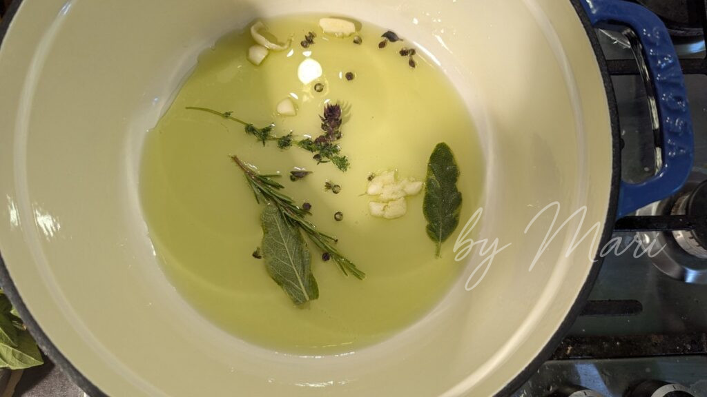 - Ароматное масло. В кокоте разогрей оливковое масло. Добавь дольки чеснока, розмарин, тимьян, шалфей и лавровый лист. Дай маслу пропитаться ароматом (1–2 минуты).