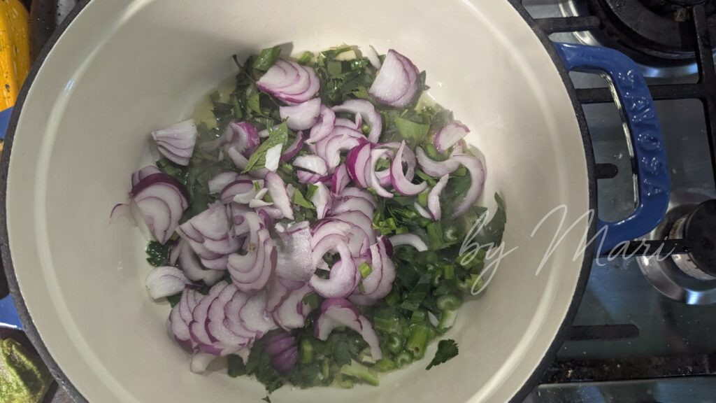 2. Основа вкуса. Выложи нарезанный полукольцами красный лук и сельдерей, слегка обжарь до мягкости.