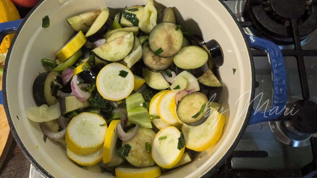 Это блюдо создано для тех летних вечеров, когда усталость берёт верх, а готовить всё равно нужно. Всего несколько движений: нарезать овощи, разогреть масло с ароматными травами и чесноком, сложить всё в кастрюлю с толстым дном — и пусть томится. В итоге получается сочное, нежное и очень ароматное рагу, которое легко заменить полноценный ужин.