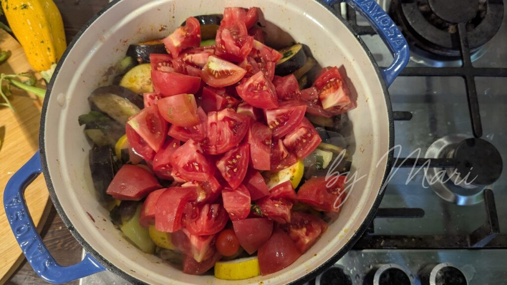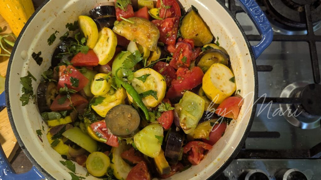 5. Томление. Накрой крышкой и готовь на медленном огне 40–50 минут. За это время овощи пустят сок и превратятся в сочное летнее рагу с насыщенным ароматом трав и специй.