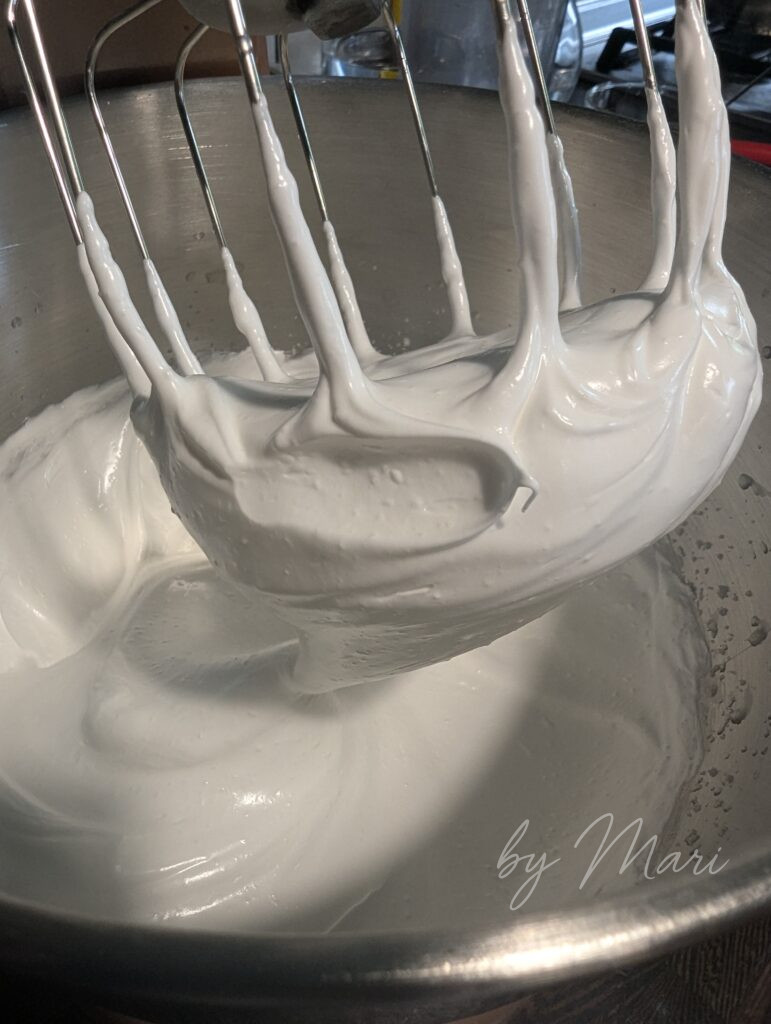 Взбивайте до устойчивых, блестящих пиков — масса должна держать форму и не стекать.