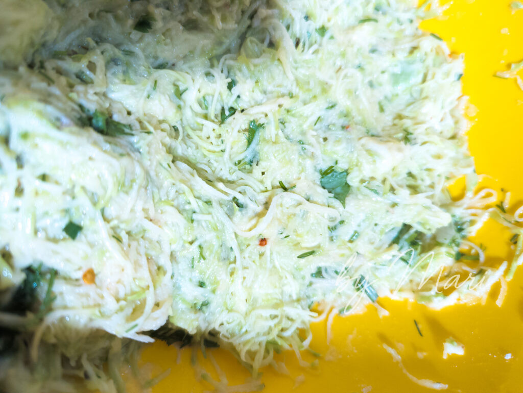 - Хорошо отожмите кабачки через марлю или руками — это важно, чтобы оладьи не расплывались.