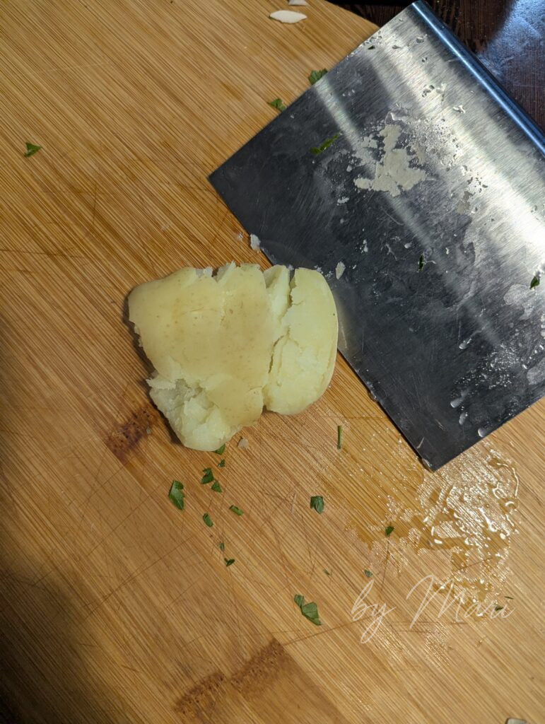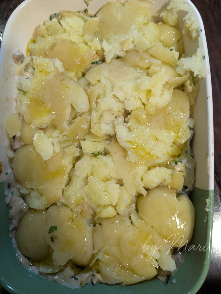Картофель варим до мягкости, но не делаем пюре. Просто слегка разминаем — ложкой или дном стакана, я делаю это шпателем для выравния торта. Пусть будет неровным — получится аппетитная, хрустящая корочка.
