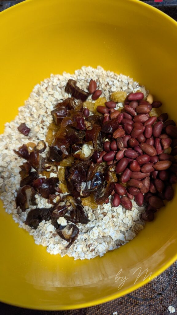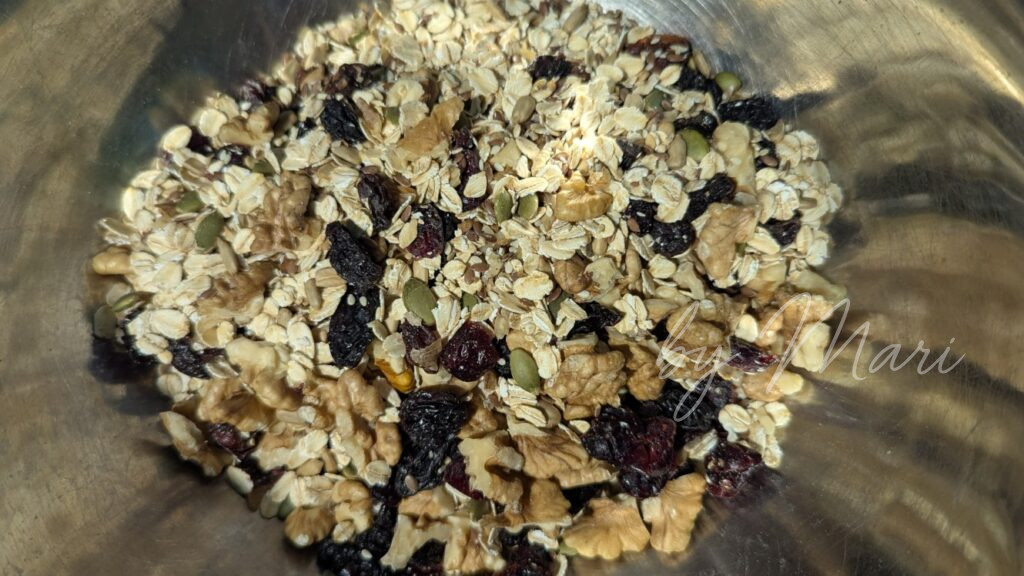- Смешайте сухую основу В глубокой миске соедините овсяные хлопья, орехи, семечки, клюкву, изюм и, по желанию, немного сушёной моркови.