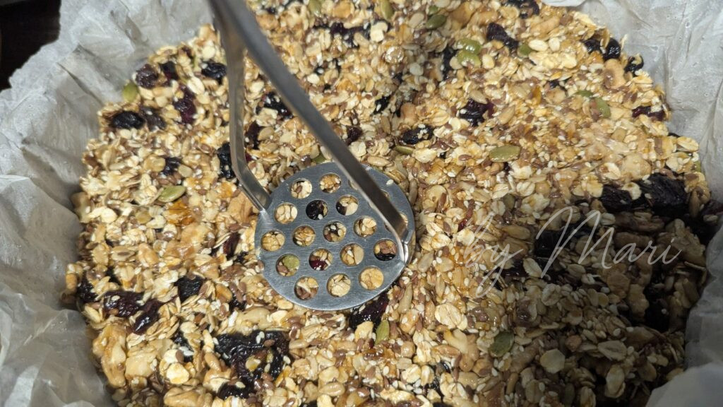 - Формуйте Переложите массу в форму, застеленную пергаментом. Разровняйте и очень плотно утрамбуйте — это важно, чтобы батончики потом не рассыпались.