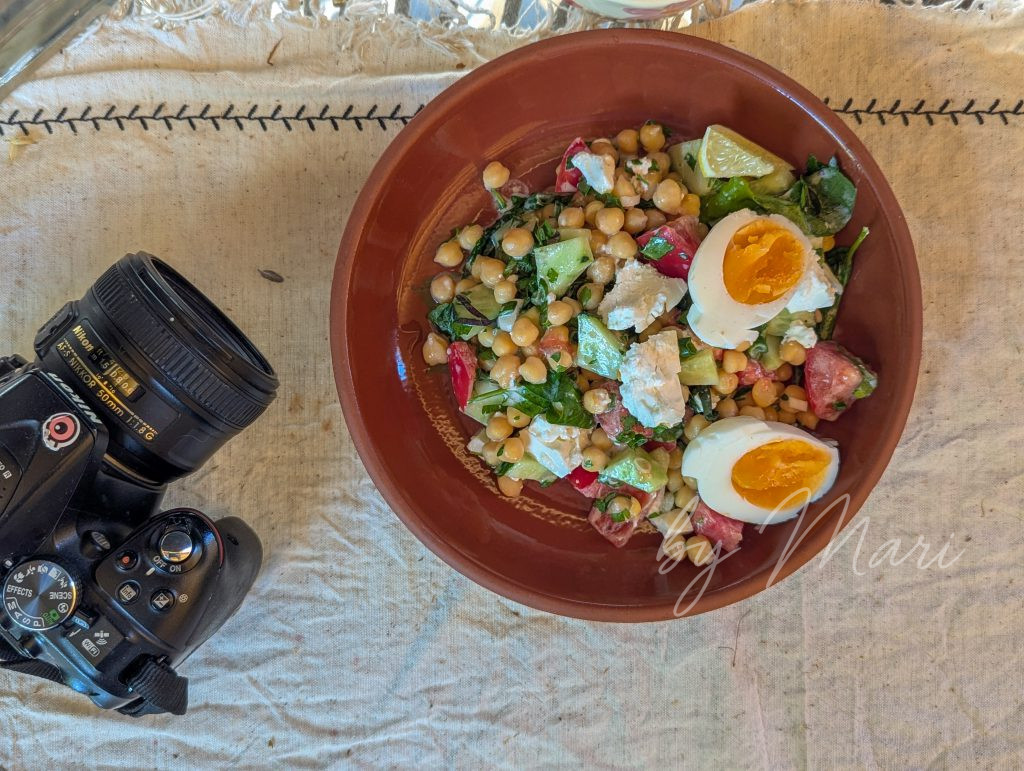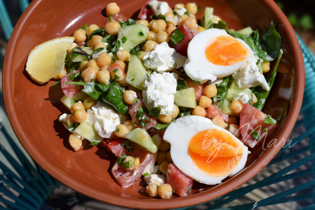 Я немного адаптировала классические сочетания: добавила яйца для сытности, йогурт вместо соуса тахини, и получился свежий, лёгкий, но питательный салат с нутом и фетой. Такой, какой хочется съесть тёплым вечером под бокал белого вина или просто с кусочком свежего хлеба.