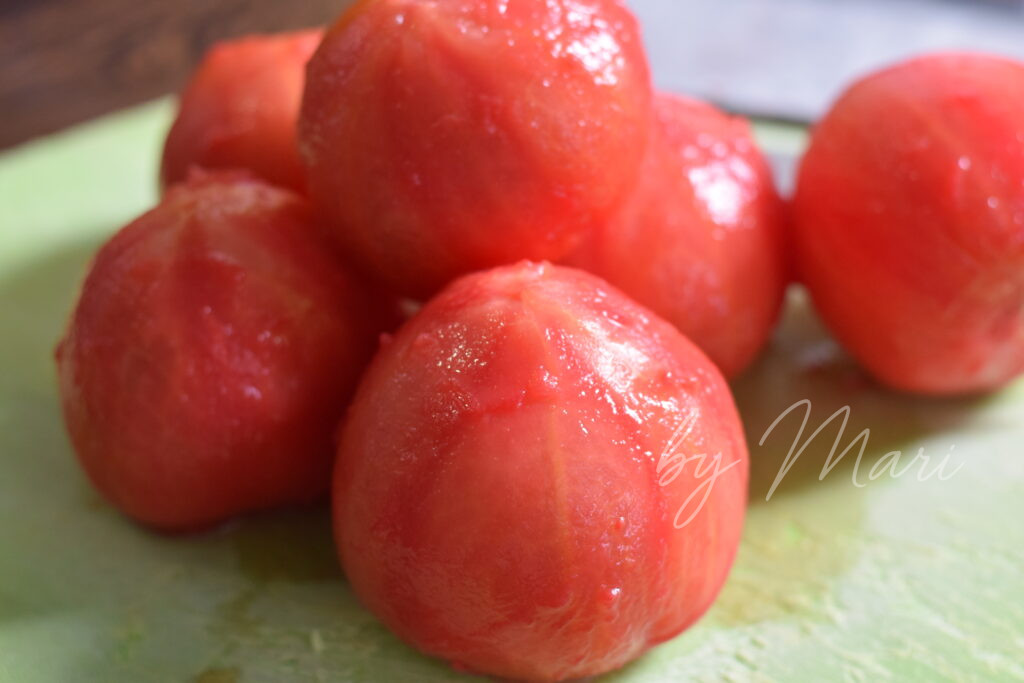 - Снять с томатов кожицу (надрезать и обдать кипятком).