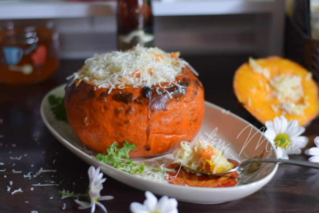 Она подаётся прямо в тыкве, имеет насыщенный вкус и получается очень сочной. В процессе запекания мякоть становится мягкой и кремовой, а начинка пропитывается сладким ароматом овоща.