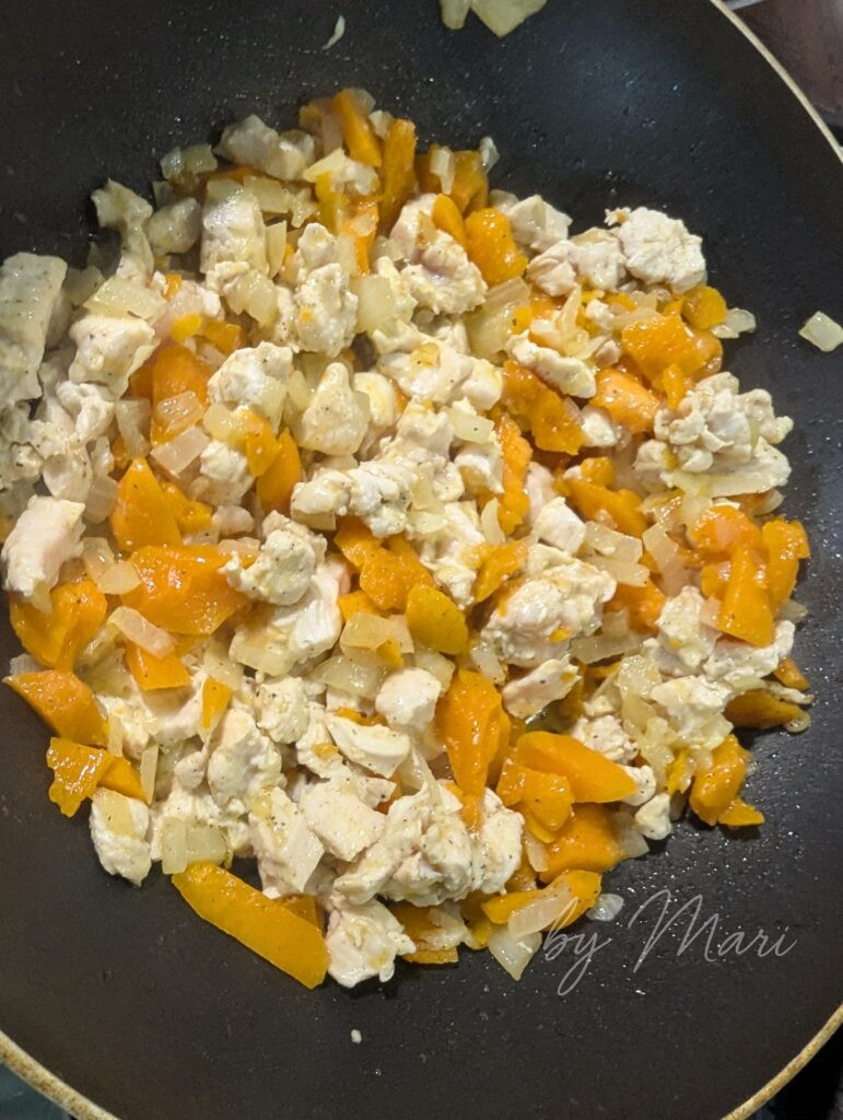 - Добавьте курицу и готовьте 5–7 минут.