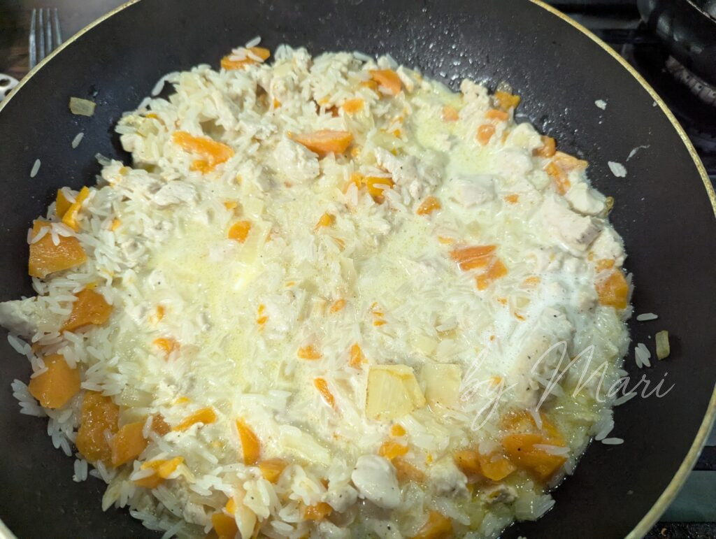 Начинка должна быть слегка жидкой, чтобы рис впитал сливки уже внутри тыквы.