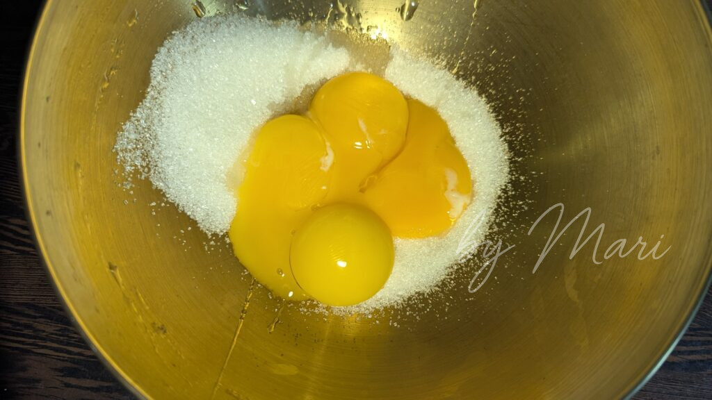 - Желтки растереть с сахаром и крахмалом до однородной массы.