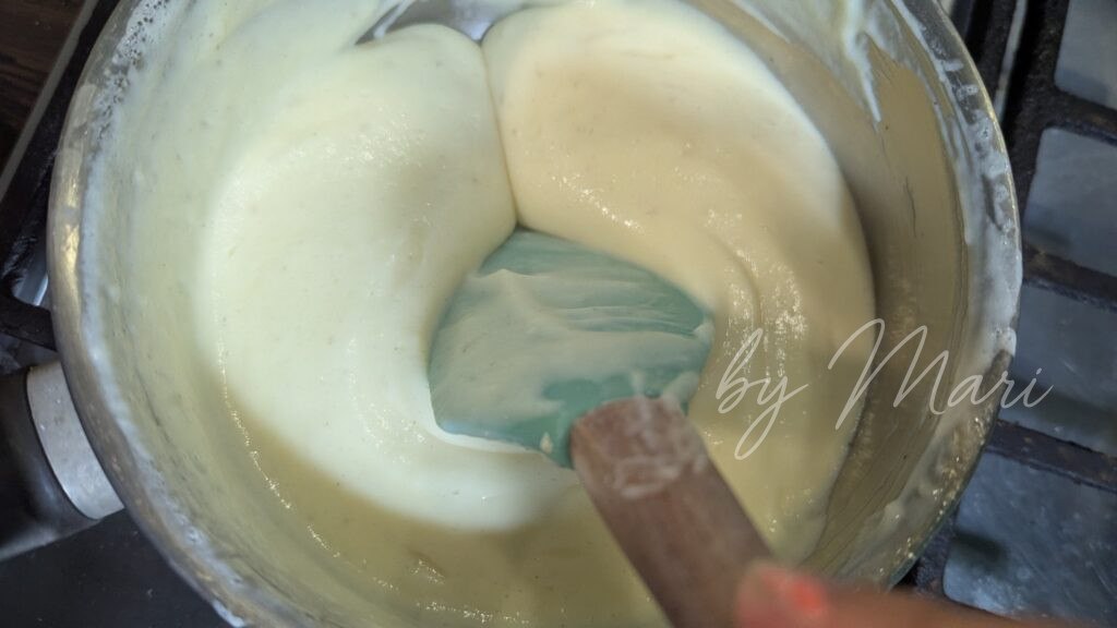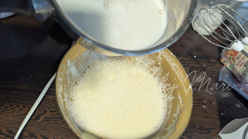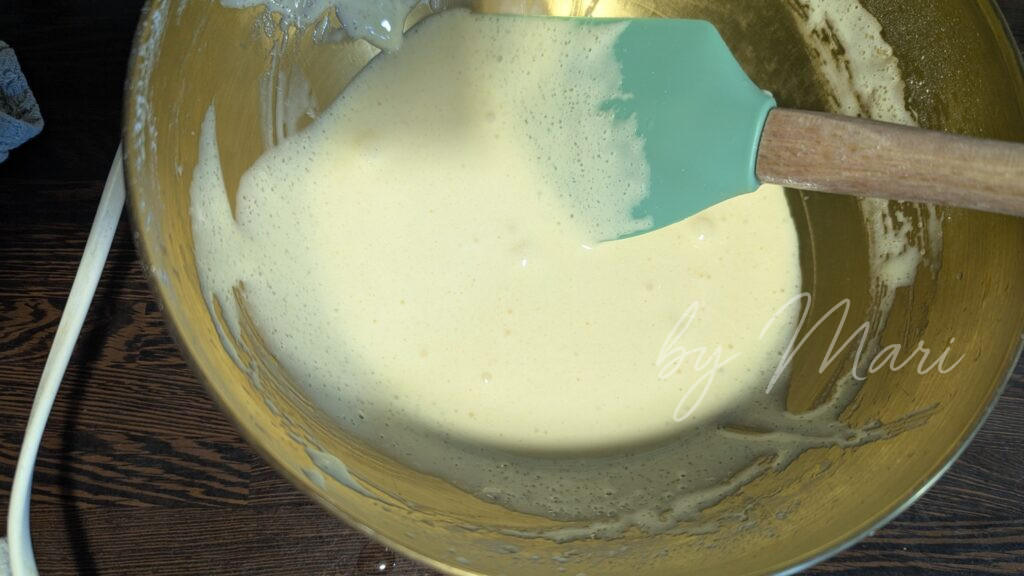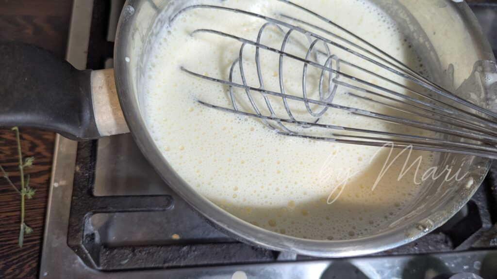 - Молоко довести почти до кипения. Тонкой струйкой влить в желтки, постоянно перемешивая венчиком.