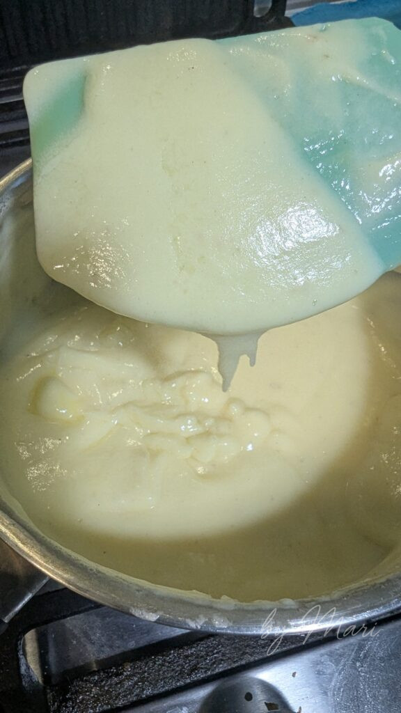 - Вернуть смесь в кастрюлю, варить на среднем огне 2–3 минуты до загустения.